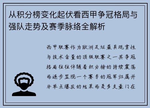文章摘要的内容:亚冠联赛作为亚洲俱乐部足球最高水平的竞技舞台,其积分榜走势不仅是比赛结果的直观体现,更是球队实力对比、战术博弈和赛制演变的综合反映。通过观察积分榜的动态变化,可以清晰勾勒出各支球队在小组赛阶段的竞争格局,以及出线形势从明朗到胶着、再到最终定型的全过程。近年来,随着亚冠赛制调整、参赛球...